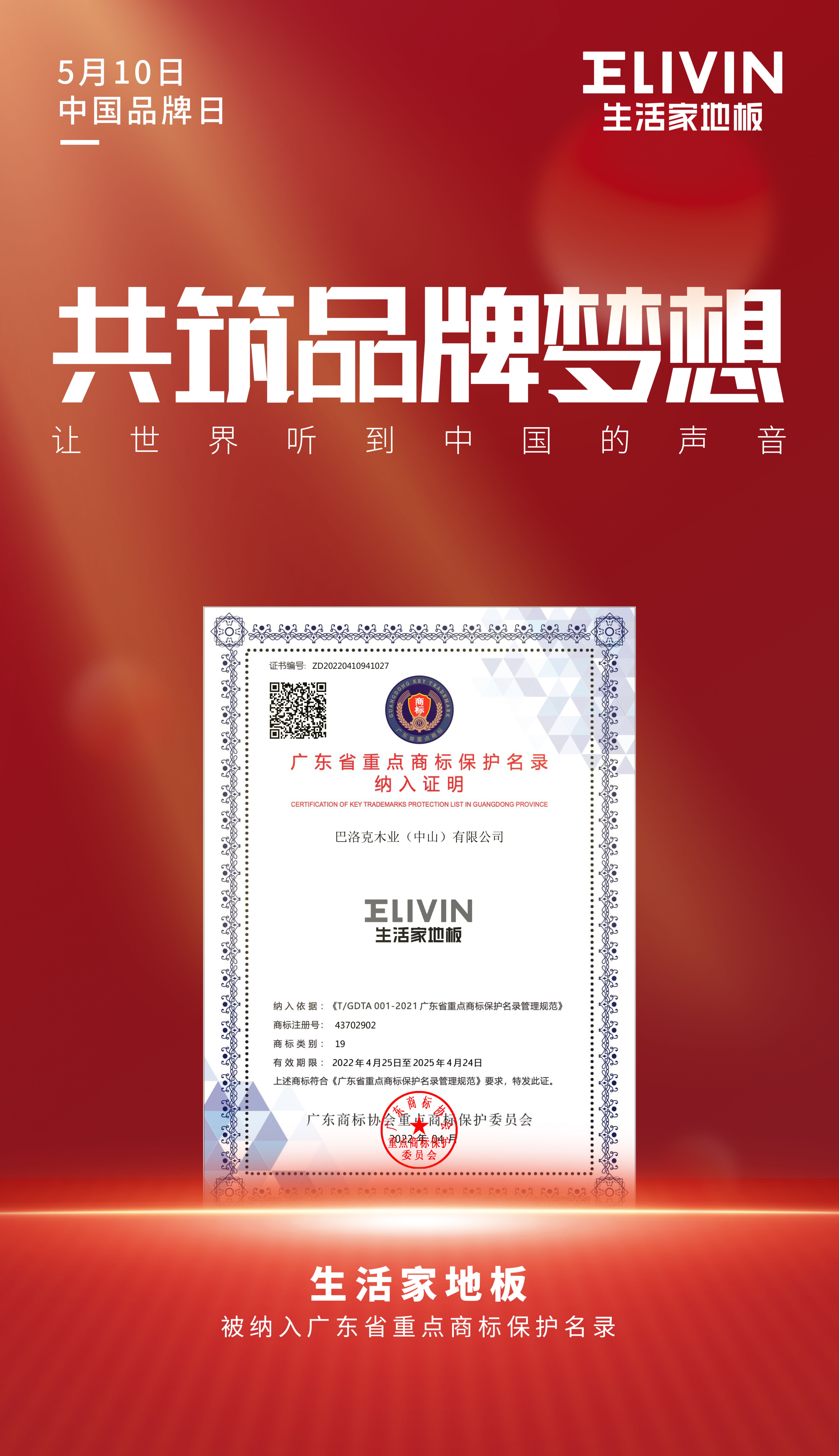 生活家地板經(jīng)過(guò)多年的品牌沉淀,以“致力成為全球最優(yōu)秀的地板服務(wù)商”作為長(zhǎng)期愿景,堅(jiān)守產(chǎn)品品質(zhì),鑄就品牌強(qiáng)勁實(shí)力。近日,生活家地板榮膺2022中國(guó)家居綜合實(shí)力100強(qiáng)品牌,“生活家地板”商標(biāo)被納入廣東省重點(diǎn)商標(biāo)保護(hù)名錄,這是社會(huì)各界對(duì)生活家地板的認(rèn)可,同時(shí)也彰顯了生活家地板品牌價(jià)值和企業(yè)實(shí)力。